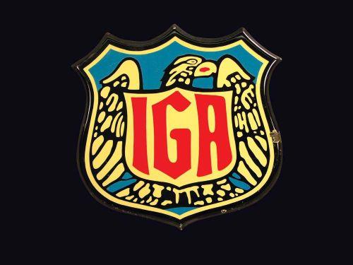 IGA Shield Eagle Porcelain Sign, four color. Edge ware chips and chip at 3:00 otherwise excellent condition. 13 X 12 1/2 inches.