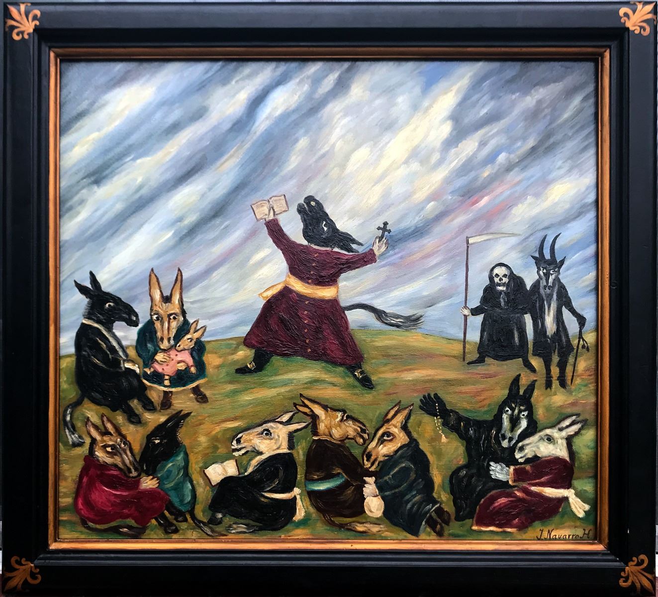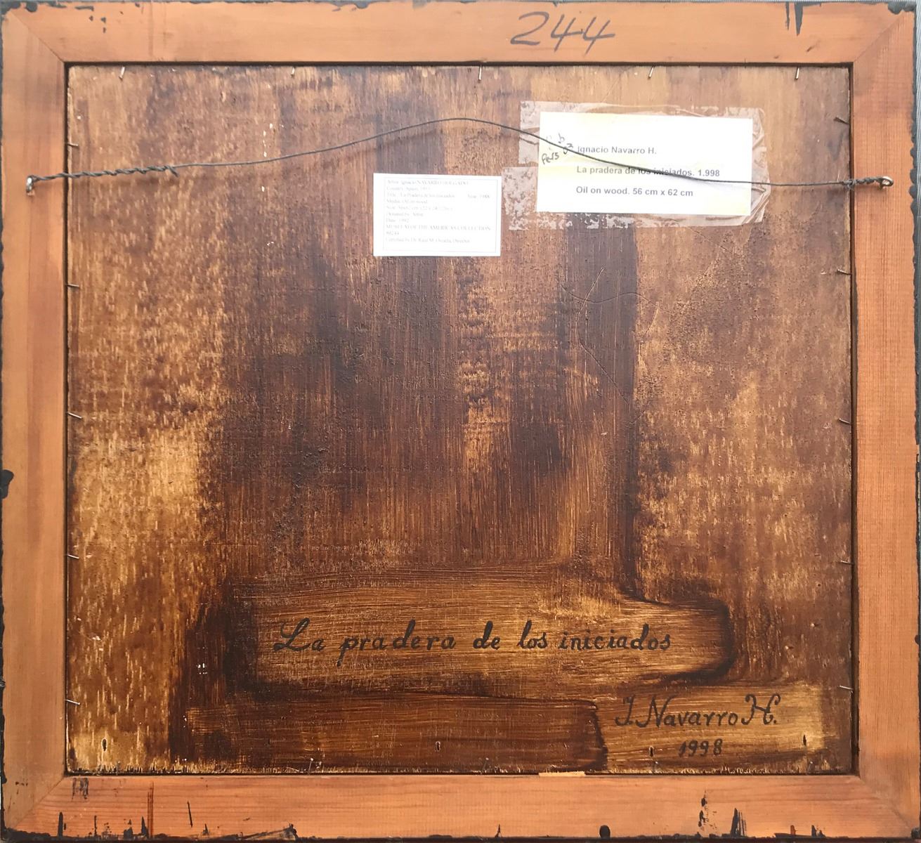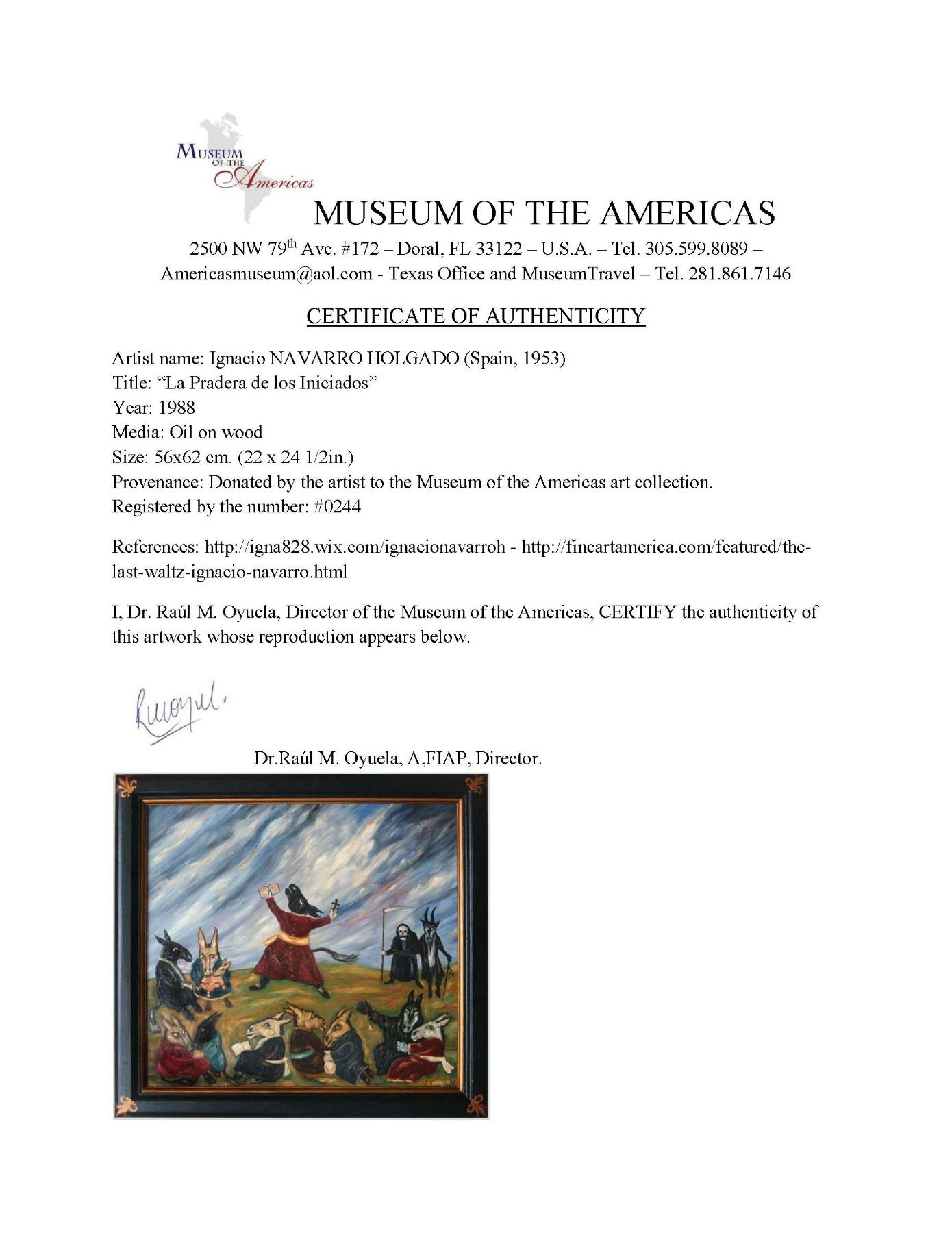 Oil on wood, entitled, "La Pradera de los Iniciados" (The Beginners Meadow). Dated 198 and signed Ignacio Navarro Holgado (Spanish, b. 1953) on the lower right corner. PROVENANCE: Donated by the artist to the Museum of the Americas (Doral, Florida, United States)