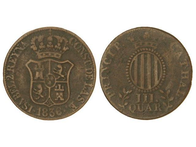III Quartos. 1836. BARCELONA. Leyenda CATHAL. RARÍSIMA. Cal-701. BC+.