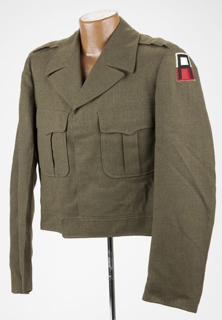 U.S. Army "Ike" jacket, green wool, ID'ed to a "Richard M. Johnson", bearing a 2nd Division shoulder patch. A few old removable spots on the back, no moth holes. Sold with a second "Ike" jacket bearing an "A" patch on shoulder, also very good.
