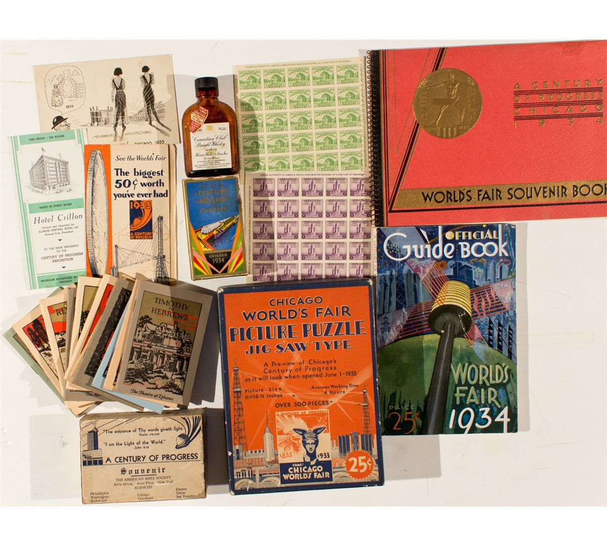 This is a lot of about seven different items from the 1933-34 Chicago World’s Fair, whose theme was "A Century of Progress."Included in this unique collection is a jigsaw puzzle, guidebook, a souvenir bible, a small sample bottle from Hiram Walker’s Canadian Club Straight Whisky (empty, of course) and two sheets of World’s Fair issued 3 cent postage stamps. Most of these items are extremely rare and all are in very good condition.