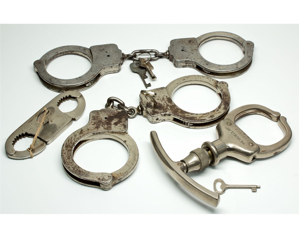 Lot of 4: 1 is a set of Gill Lion Tamer thumb restraint. Approx 4L x 1.3W, stainless steel construction, ratcheting operation, with key. 2 is a set of Peerless Handcuffs Co. Of Springfield Mass. Serial No. 52742. Swivel chain connection, ratcheting operation, with key. (2 keys, 1 is bent, but functional) 3 is the unique Iron Claw type of come-along restraint, serial No. 185859 from Argus Mfg Co. Of Chicago IL. Pat. 1950757 20666543, from 1931. 4 is another chain-connected cuff set, by Smith Wesson, probably c1900. (2) keys provided. The Iron Claw is of special interest, as many thousands were produced and used, and were especially liked by law enforcement officers. This particular model is the improved version with the splined teeth covered by a sliding collar, which prevented the nipping experienced by the carrying officers in the original uncovered model. Also notable is both Peerless and Smith Wesson continue to currently supply modern cuffs and restraints to law enforcement today. HKA#62604