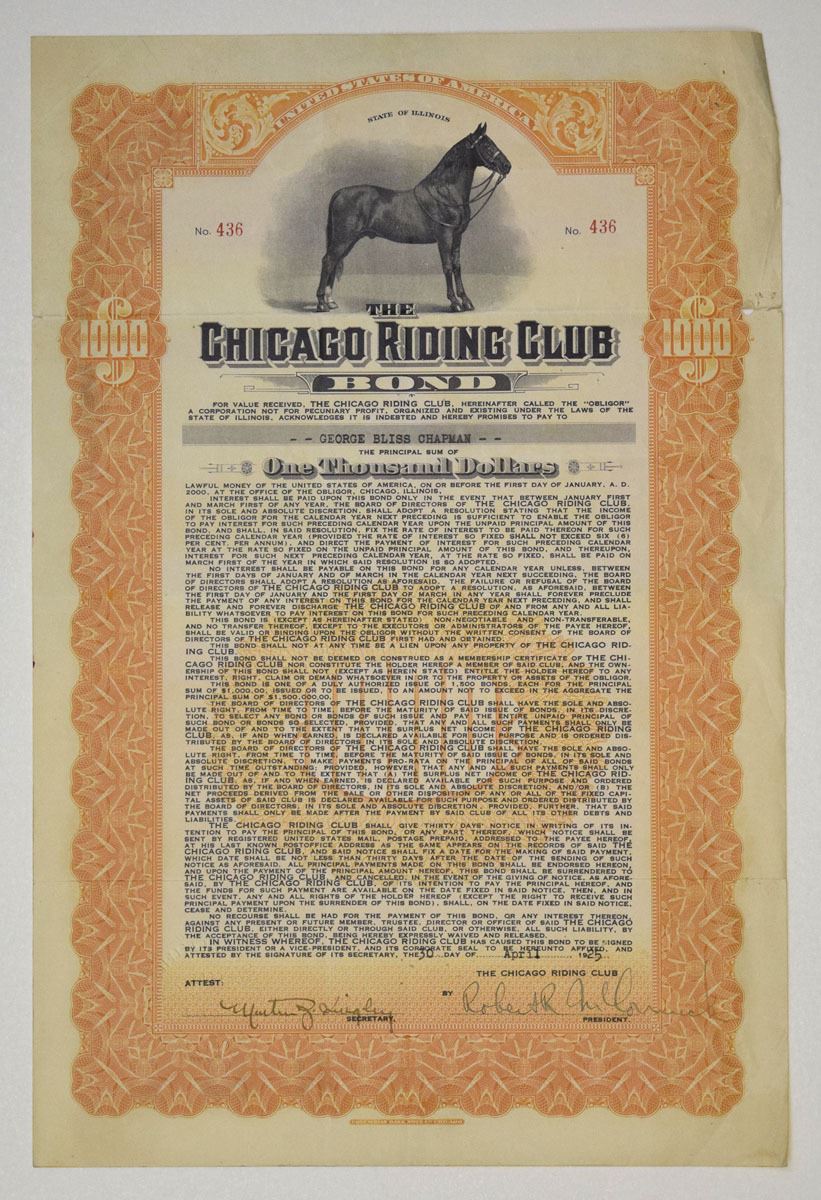 Illinois, 1925. $1000 I/U 6% Coupon Bond, Black print on orange border and underprint, Vignette of horse in profile at top center, S/N 436, Fine to VF condition with splitting at fold lines, CBNC.