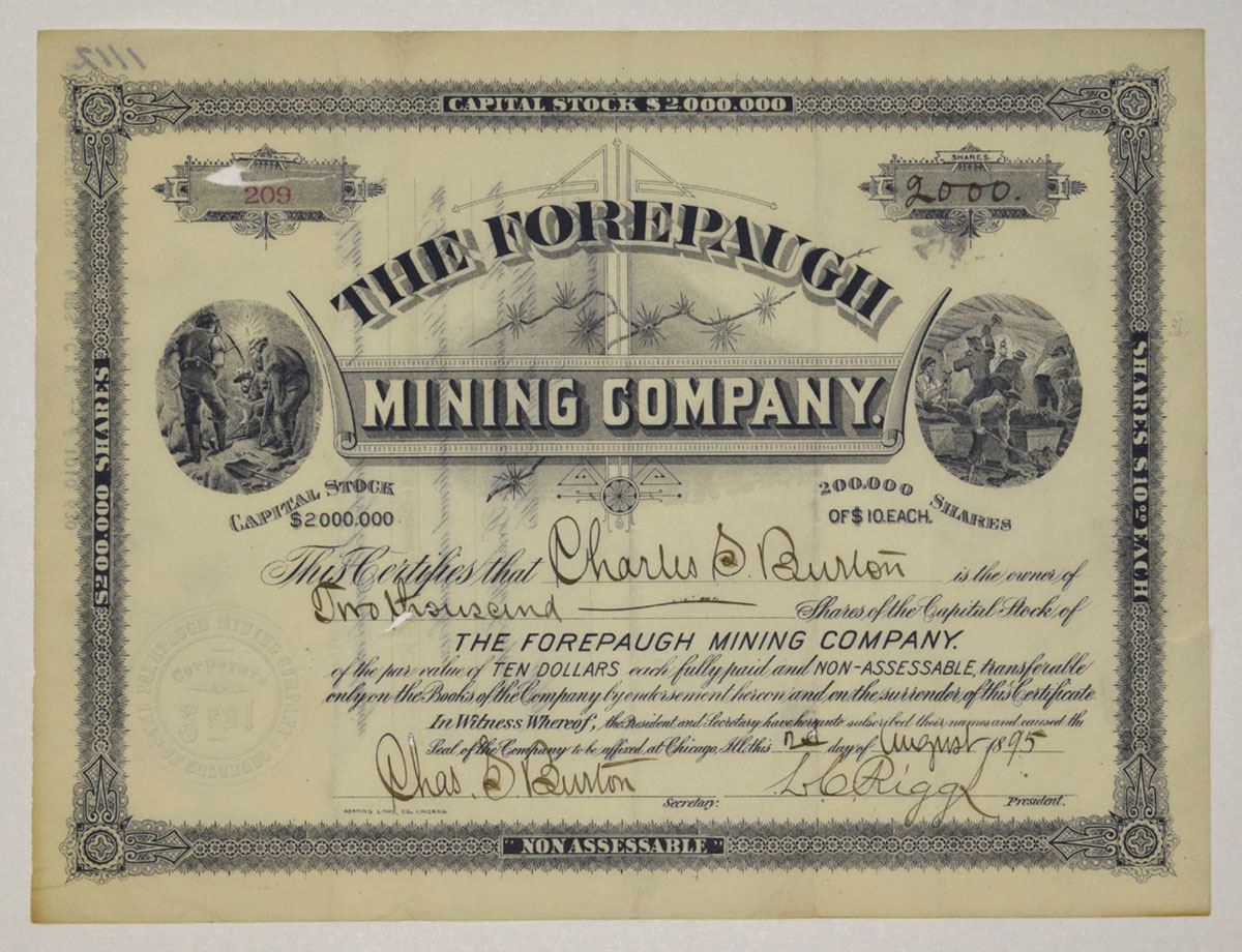 Chicago, Illinois, 1895. 2000 Shares Capital Stock I/U Certificate, Black print with black border, Mining vignettes flank title at center, S/N 209, Fine to VF condition with splits. Forepaugh Mining Co., 1895 — Incorporated in Illinois during 1895, the Forepaugh Mining Company was organized as a speculative venture at the height of the late-19th-century American mining boom. While incorporated in the Midwest, no confirmed records link the company to any active mines or claims in Colorado or the western states. A similarly named “Forepaugh Gold Mining Company” is listed in period Colorado mining manuals, but no documentation connects it to the Illinois corporation. The Forepaugh Mining Co. thus appears to have been one of many promotional enterprises formed to capitalize on investor enthusiasm for gold and silver mining ventures of the era rather than an active producer. Certificates from this issue are scarce survivors from that speculative period in American mining history.