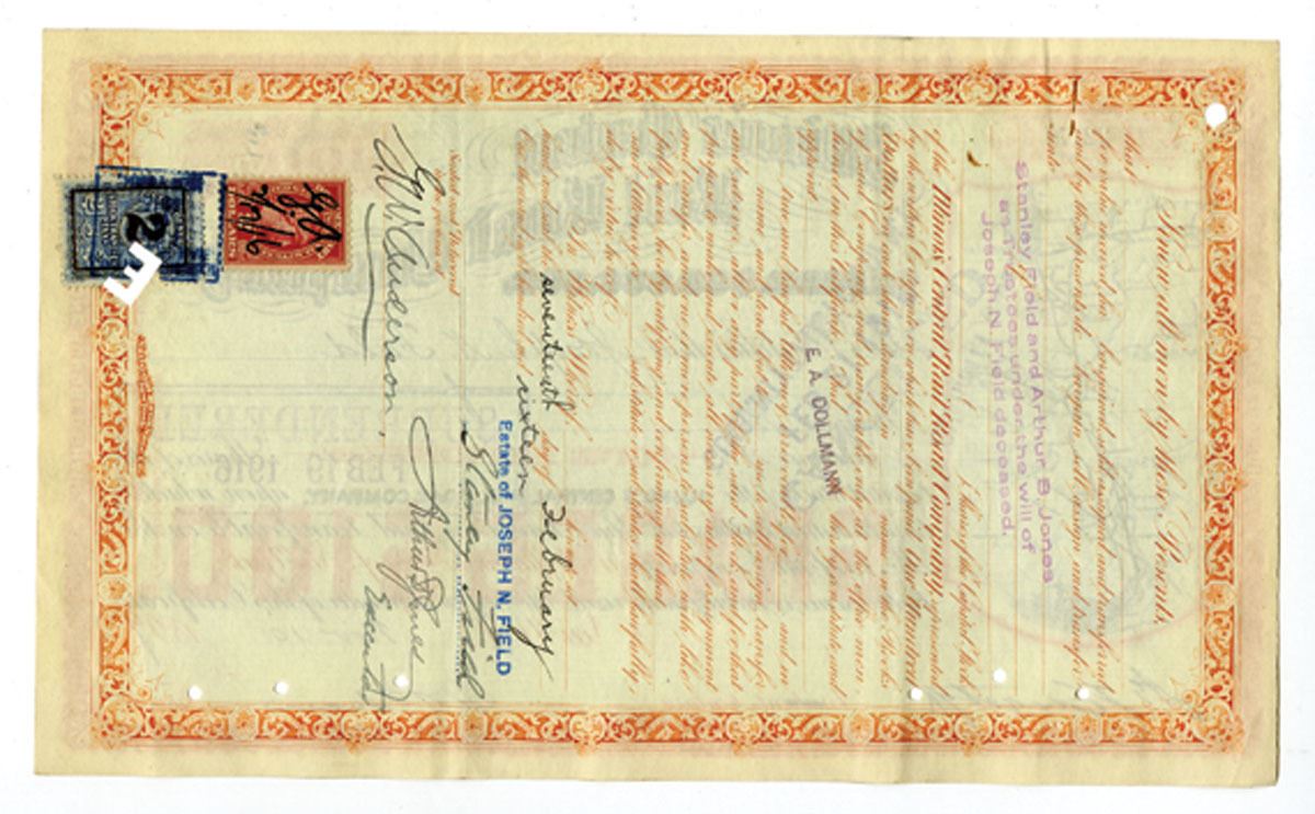 Illinois, 1899. 100 Shares I/C Capital Stock Certificate, Black print with orange border and underprint, Map of train lines from Illinois to Gulf of Mexico at left, Company title at top, Issued to but not signed by Field. The back is endorsed but signed by Stanly Field "for the estate of Joseph N. Field". Joseph N. Field was an American businessman and corporate officer active in the late 19th century. He served as a trustee, director, or executive in a number of railroad, insurance, and financial companies during the post–Civil War industrial boom. By the 1890s he was well established in corporate circles, appearing on stock and bond issues as an officer or signatory. Field’s career reflects the generation of financiers who helped manage the rapid expansion of transportation and utilities in the United States at the turn of the century. POCs and stamp cancelled, VF to VF+ condition. ABNC.