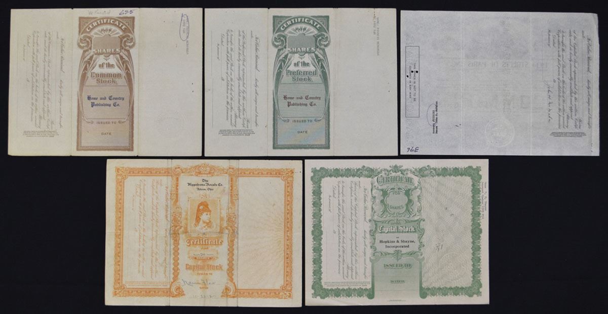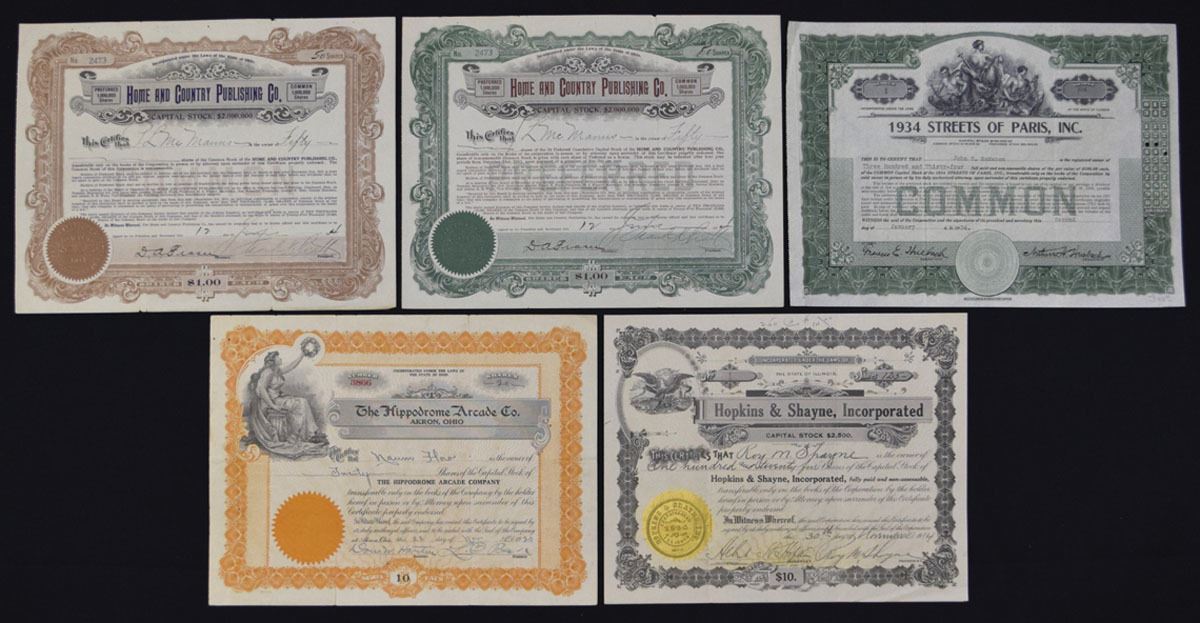 Illinois & Ohio....., 1914-34. Lot of 5 I/U Stock Certificates representing publishing, entertainment, theatre, and exhibition companies, each with engraved vignettes and ornate borders. Includes examples from Home and Country Publishing Co. (2); 1934 Streets of Paris Inc.; Hippodrome Arcade Co.; and Hopkins & Shayne Inc. Conditions range from Fine to VF+ condition with splitting at fold lines. (5). Sold "AS IS" no returns accepted.