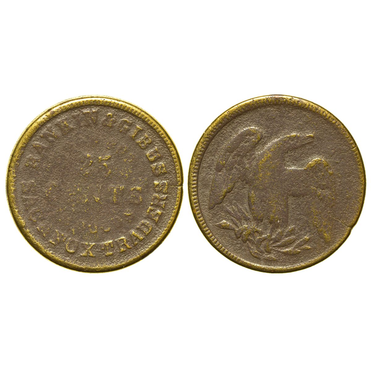 Rev. Rankin & Gibbs/Sac & Fox Traders. For 25c in goods. Obverse with eagle. The Sak and Fox are an Algonquin tribe that paired up after several wars which nearly killed the Sac tribe off. After pairing up, each of the respective tribes kept their own chiefs and tribal characteristics. The Sac tribe was typically seen as the more warlike tribe by European traders and explorers. The Fox tribe were named so from the fox band of the Meskwakie tribe who had the fox as their totem. Initially the Fox tribe suffered from their protection of the Sac tribe. The French enlisted other tribes to war with the Sac and Fox until their numbers decreased significantly within a few short years. This also caused the tribe to move down the Mississippi into southern Illinois from their original home in Saginaw Bay and the Detroit area [tripod.com/saukfox].