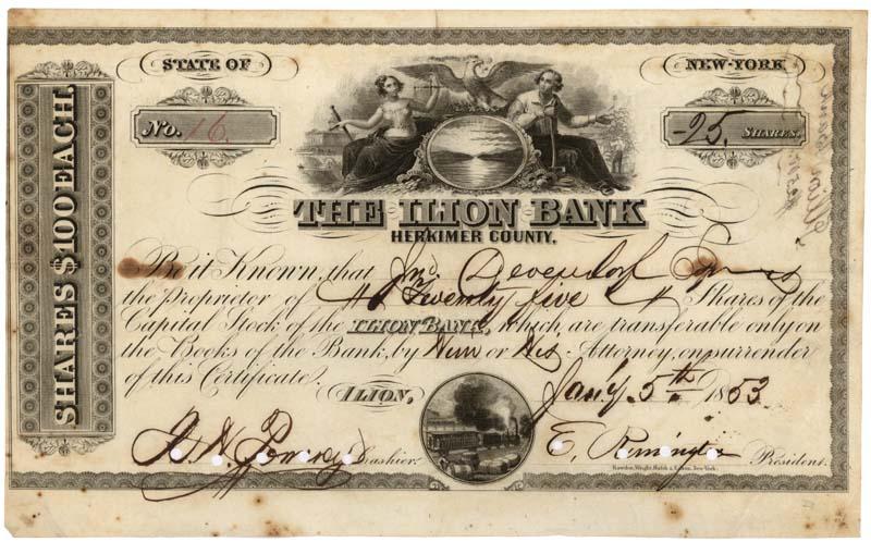 1853, New York. Stock certificate for 25 shares. Black. Engraved vignette of the state seal flanked by seated male and female figures. A small steam locomotive at bottom center. Signed as president by Eliphalet Remington (1793 - 1861). Early gun maker. Founder of E. Remington & Sons. Remington supplied guns to the United States during the Mexican-Amercian War. His children carried on the company. Some foxing, very good. Four simple hole cancellations through the signature.