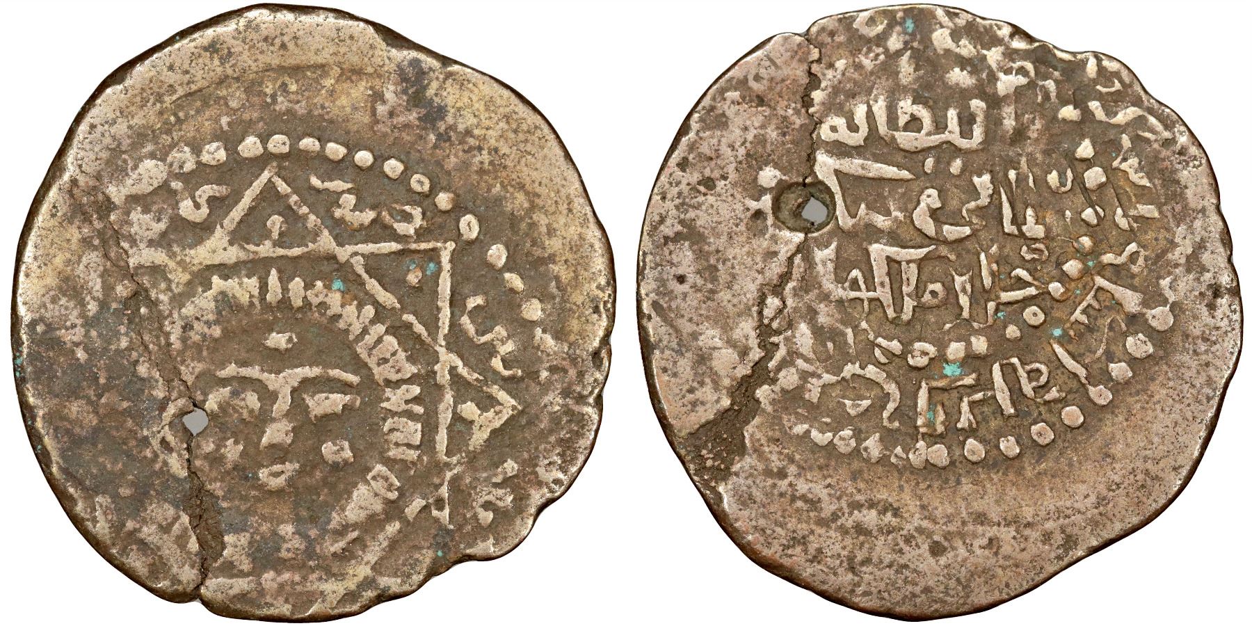 ILKHANID: Queen Sati Beg (1338-1339), AE Fals (2.09g), Mardin, [AH 739]. Sun-face within an octagram. A-D2233.1. Choice very fine. Rare.