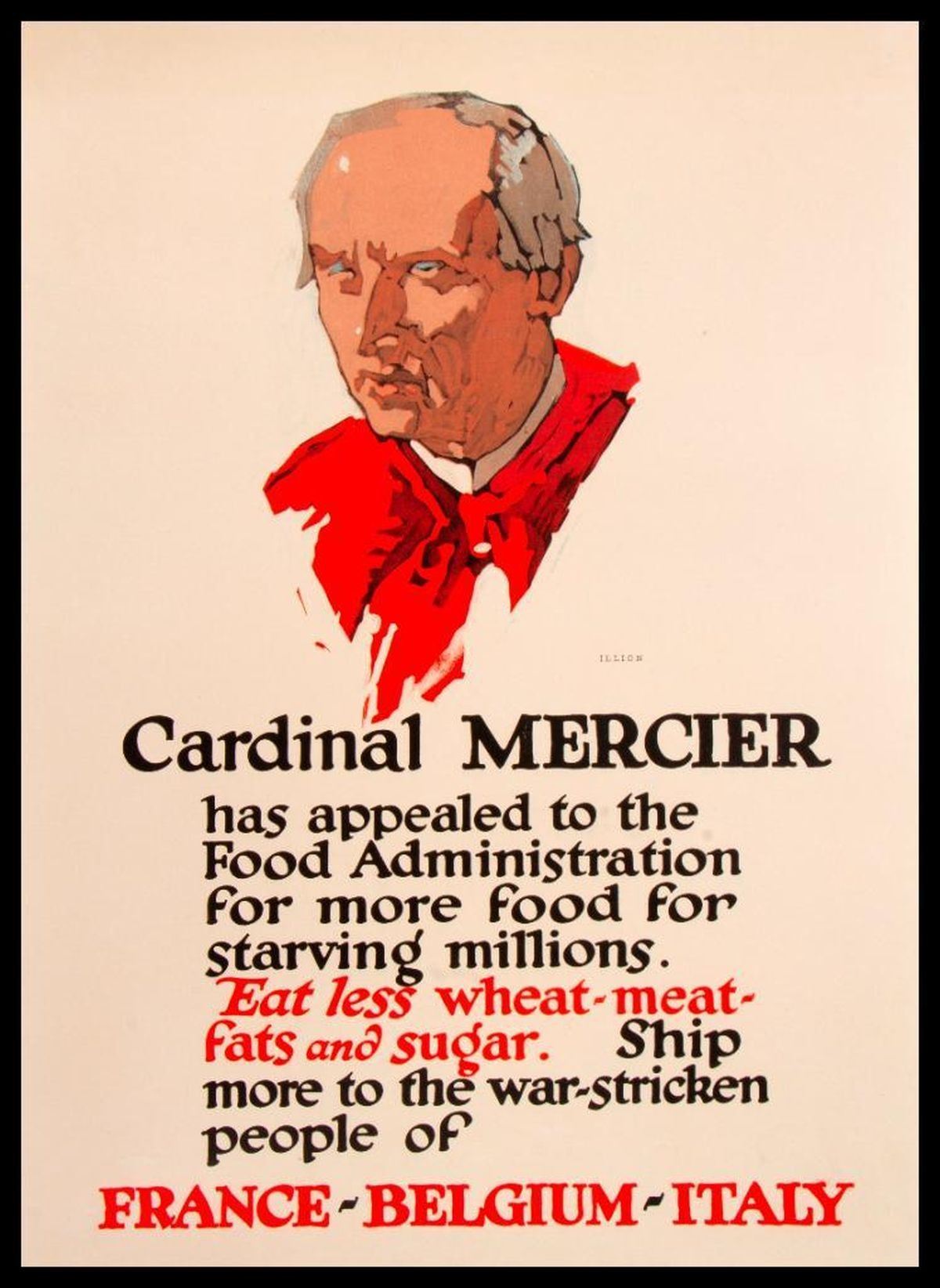 Vintage World War I Poster. "Cardinal Mercier" (Eng. Text), 1918. Paper size: 31 x 24 inches. Linen backed. Condition: Overall good; toning; some creases along edges.