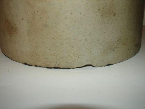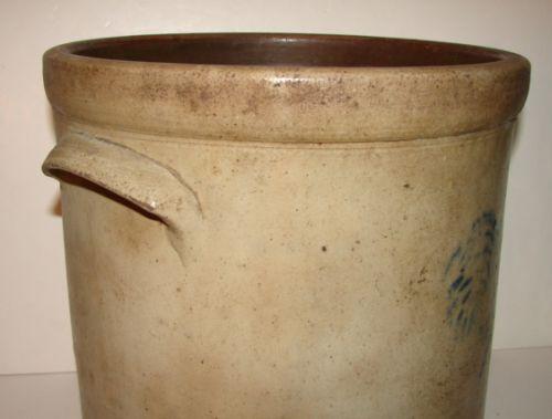 BLUE DECORATED ILLINOIS STONEWARE CROCK. 5 gallons. Eared handles. Cobalt blue stenciled rooster decoration at back of body. Cobalt blue stenciled text at front of body reads “?.P. M?nson/5/??mmessee/Ill.” Incised line decoration around top of body. One handle shows chipping. Shows one large chip at edge of base. 12.5” H
