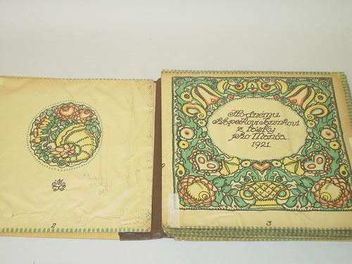 ILLUSTRATED CZECHOSLOVAKIAN CHILDREN'S BOOKS. 2 Volumes as Listed. 8vo - over 7¾" - 9¾" tall. Ex-Library. Fair condition. ***The Cock and the Hen by Rudolf Mates (1925) 1st American Edition, NY: Raf. D. Szalatnay/Chechoslovak Art & Craft. 13 double-sided unbound leaves, protected in permanent plastic, in a portfolio with ties. Illustrated throughout with colors still bright, text in English. ***Illustrations to a Lullaby, with illustrations by M. Fischerova-Kvechova (1921). Text in Czechoslovakian, 26 unbound leaves, protected in permanent plastic, in a portfolio with ties. Two leaves missing, pages buckled. Delightful color illustrations throughout.