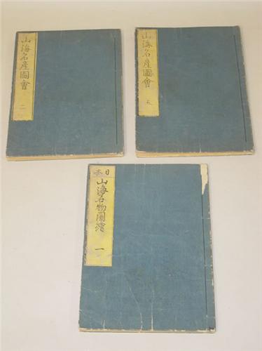 ILLUSTRATED JAPANESE - COMMERCE. A Group of 3 Volumes as Listed. 4to - over 9¾" - 12" tall. Soft Cover. Ex-Library. Good ++ Condition. All in matching blue paper, single stitched, accordian style pages on tissue thin paper with text in Japanese. Full page b/w ILLUSTRATIONS convey activities of mining, forge work, stonework, hunting, fishing, gathering, mining, spinning/weaving, pottery & shipping. One of the volumes carries images of the Sankai Meisan Dzu-ye, drawings by Kwangetsu. General cover wear.
