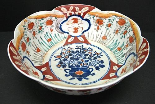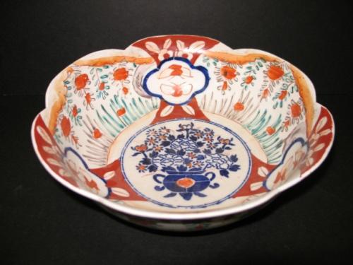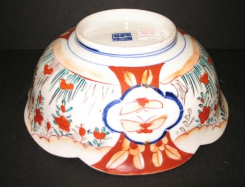 IMARI CHINESE EXPORT PORCELAIN BOWL. Beautiful blue, orange, green and red floral decoration. Opened scallop edge. Marked on bottom. 3.5" H, 9.75" Dia.