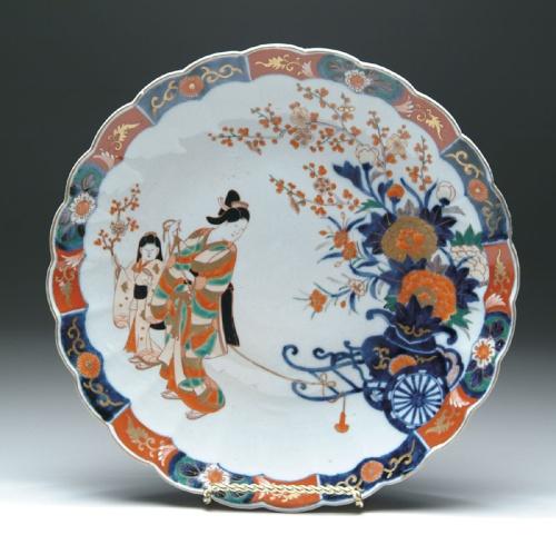 IMARI DECORATED CHARGER. Nice colors of deep blue, rust, green and gold. Decorated with mother and child with vase of flowers. Back side has vine of flowers. SIZE: 14-3/4in.. CONDITION: Restoration to one chip on edge, otherwise very good. 9-26316