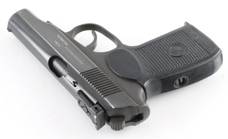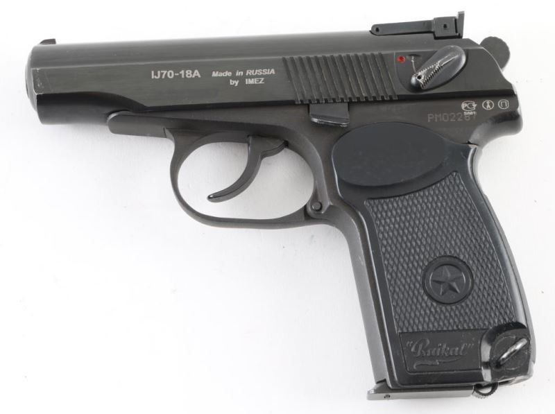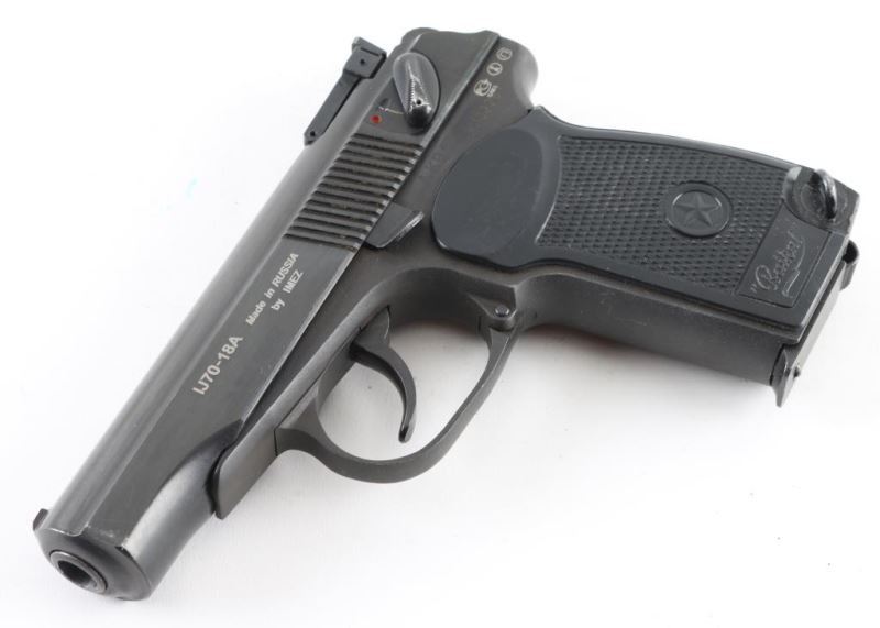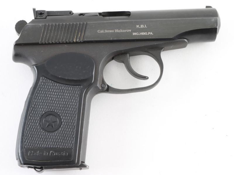 Pistol. Semi-Automatic. 8+1 Capacity. "Makarov" Russian Made. Produced 1949-Present. Standard Military/Police sidearm of the Soviet Union. Commercial version. Blowback action. 3.68" barrel. Front blade and drift adjustable notch rear sights. Slide mounted thumb safety, Imported by K.B.I. (Right slide) Blued metal slide. Parkerized frame. One-piece checkered/serrated black plastic grips. with Russian star. Lanyard ring. Bore appears excellent/bright. Blue finish is about 95% with some minor edge wear/scratches. Slide action is smooth/tight. Grips are very good. Comes with one 8-rd magazine . Comes in the original factory box with manual. NRA Condition-Very Good. Modern Firearm.