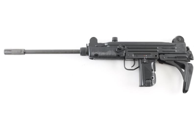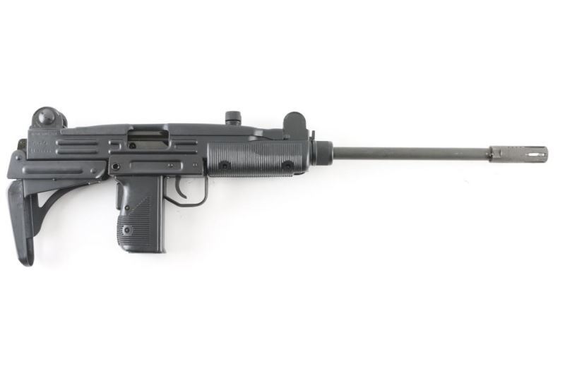 Rifle. Semi-Automatic version of the Uzi sub-machinegun. Made is Israel by IMI, and imported by Action Arms Phila. Pa. (Left receiver) Imported 1983-1989. Same as the Model A, with improved sights, and sling swivels, and a firing pin safety. 16" removable barrel with protected adjustable front post, and adjustable flip rear sights. Barrel has a "Fabian Bros" 9mm muzzle stabilizer spot welded on. Bayonet lug. Top charging handle, collapsible stock. Safety selector on left grip, with grip safety. Black enamel flat black finish with black plastic ribbed furniture. Bore appears very good but a little dark/dirty. Metal finish is very good with a few minor scratches. Safety selector has a small chip. Furniture is very good. No magazine. NRA Condition-Very good. Modern Firearm.