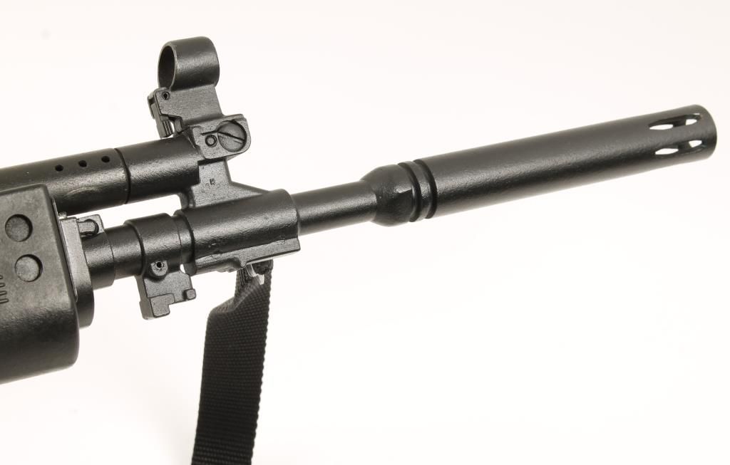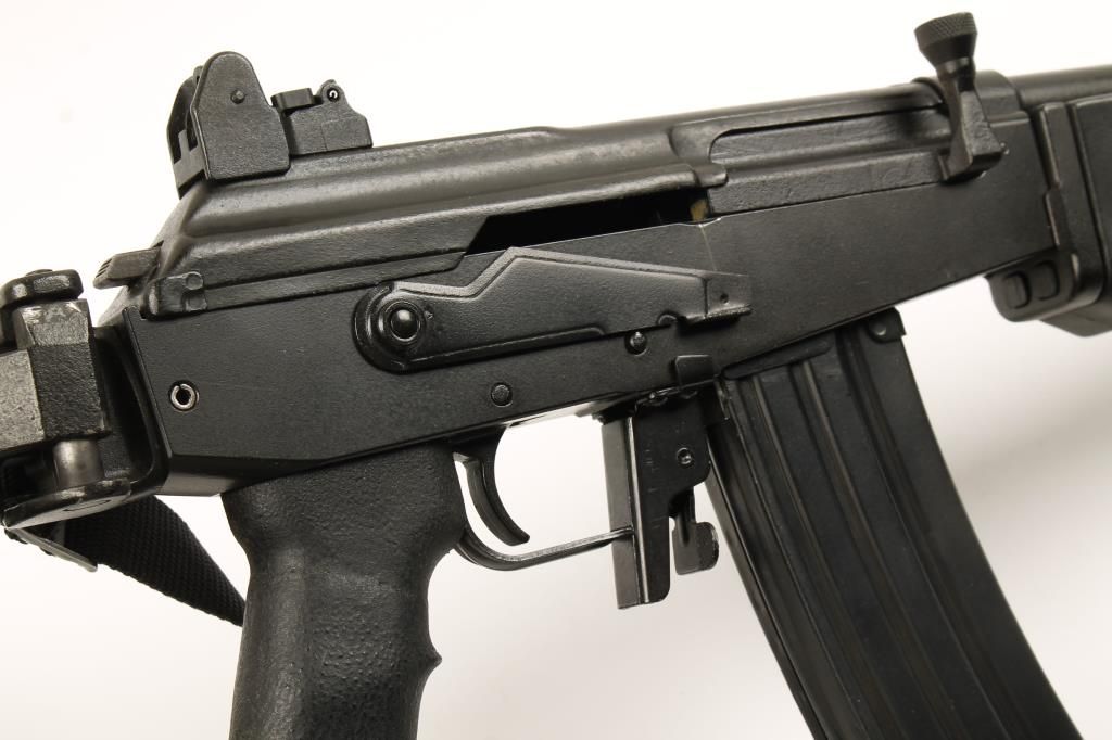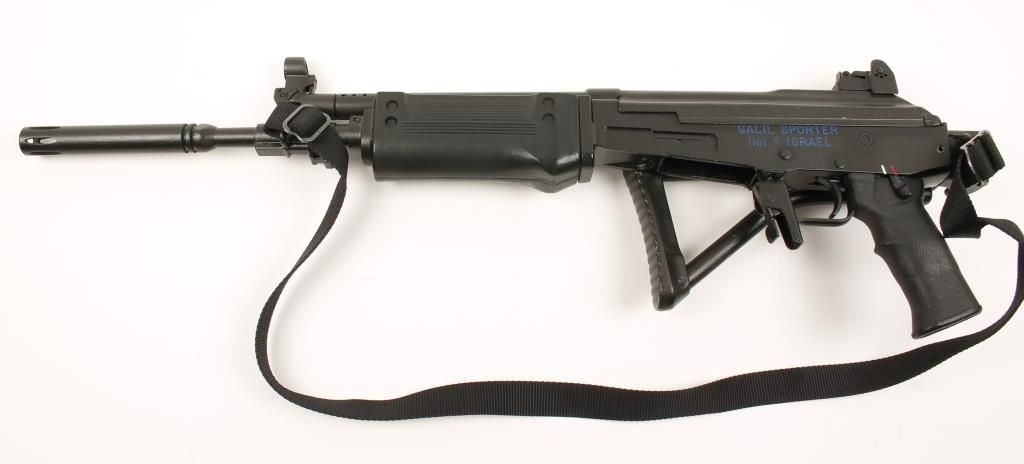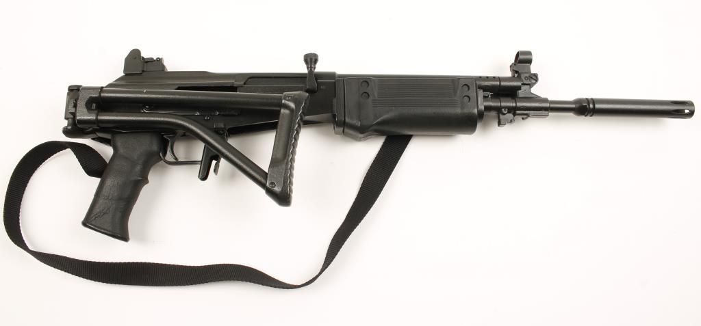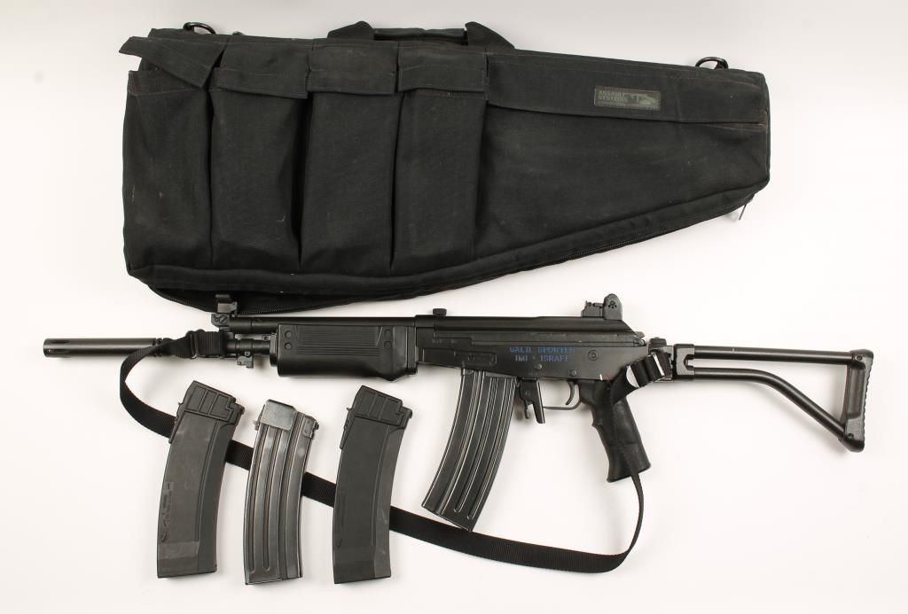 Israeli semi auto rifle with 18" barrel. Black finish, Folding butt stock, black synthetic pistol grip and forend, hooded front sight, rear aperture sight and canvas sling. Good bore and action. Includes soft side tactical case and (4) 30 round magazines.
