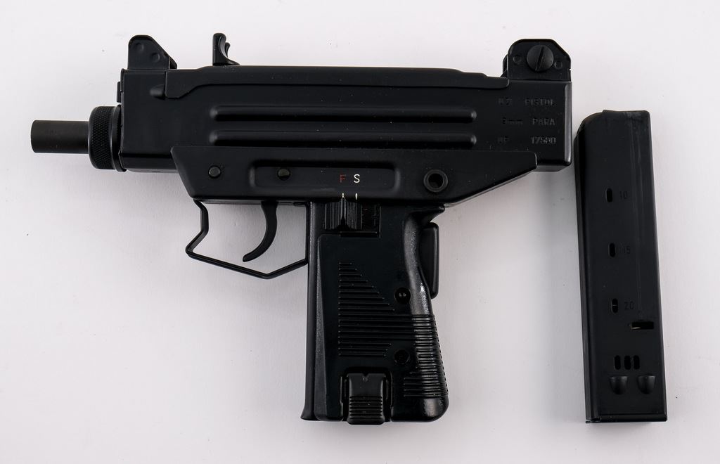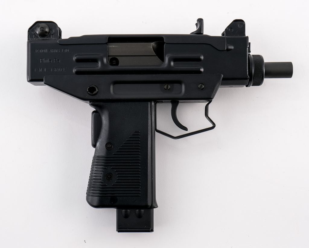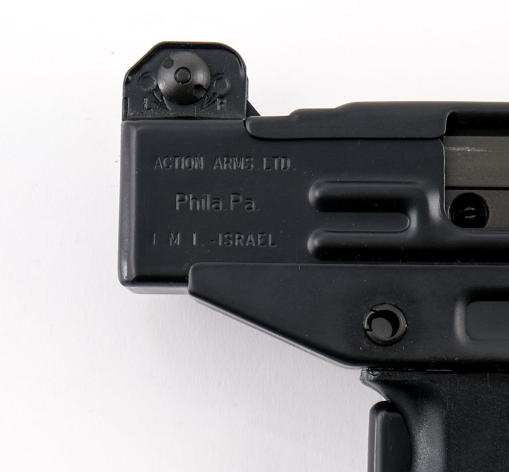 Iconic Israel Military Industries pistol imported by Action Arms prior to the 1989 Assault weapons import ban. This 9mm Uzi remains popular today by frequent interest in hollywood and pop culture. Compact, total length under 10" with a 4.5" barrel. Adjustable front & rear sight. Manual and grip safety. Includes one 20rd magazine and original serialized paperwork. Condition: Dealer New Old Stock. Never owned in private hands. Appears unfired outside of factory. Still has factory grease shellacked on receiver. Missing sight tool.