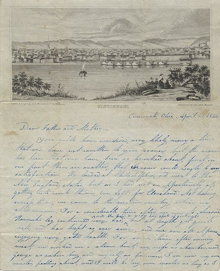 Fine content A.L.S. on illustrated letterhead showing the city of Cincinnati, 4pp. 4to., Cincinnati, Apr. 21, 1844 in which Jonas and Hannah Bandsley write to their parents in England for the first time since they arrived in America. In part: "...We landed in Philadelphia, and went to the New England states...I had not an opportunity of getting much work there, we left for Cleveland. Not having success there, we came to the western country, where we still remain...we worked on a stem boat...I am now my own master...we went one trip up the Red River, three hundred miles further than any other boat went before, right up amongst the Choctaw, Cherokee and other indian tribes. While up there our boat was wrecked...we had not means of getting back...but by means of indian canoes, incamping at night in the woods...crocodiles, alligators, bloodsuckers, vampires, and other dangers...in the woods were bears, wolves &c but the most nearly ate us up were the musquitoes...George took bad of the billious fever...it is desperate hard work to get hold of money...Hannah has got many of the Yankee way; she is obliged to have the floor carpeted to save her hurting her knees by cleaning. She has little to do but rock herself in the chair...". Folds and somewhat soiled, still quite good.