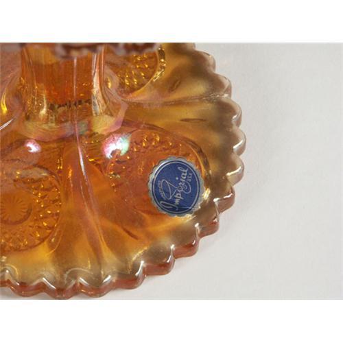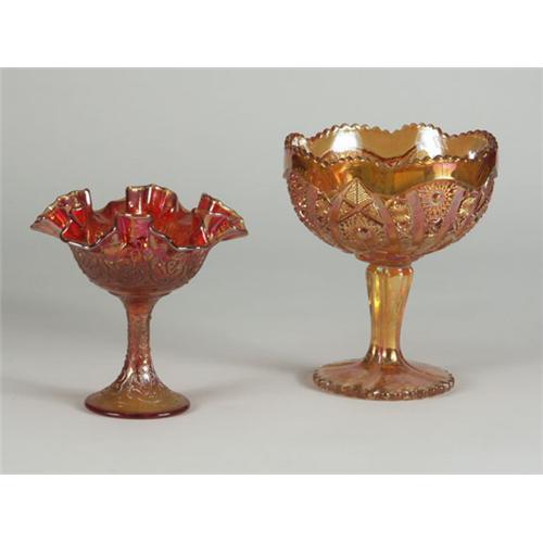 Two carnival glass compotes. The first is an Imperial marigold pedestal compote, possibly ''Hobstar & Arches'' circa 1910, Original Imperial sticker still attached to base, 7.5'' x 6.5'', no chips or cracks noted. The second is a Fenton (hallmarked on underside) sunset red ruffle rim compote, Persian Medallion, 6.5'' x 6'', no chips or cracks noted.