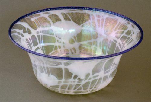 IMPERIAL ART GLASS BOWL transparent ground, white heart and vine decoration and applied blue rim, unsigned, 8 1/2" diameter