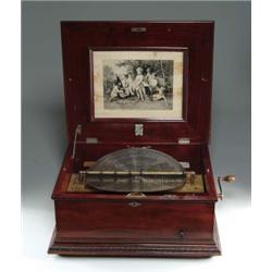 IMPERIAL COIN-OP SYMPHONION. Ca. 1900. Though American made, it is of a German design. Single comb, center drive machine with elaborate carved edges, playing 15" discs (of which 6 discs are included). Penny-operated with push-button start. Interior lid shows paper litho of 7 cherubic musicians (paper is torn and repaired). SIZE: 23 1/2" w. x 11 1/2" h. x 21" d. CONDITION: Some corner chips, refinished, otherwise very good to excellent. 1-4590 (3,000-5,000)