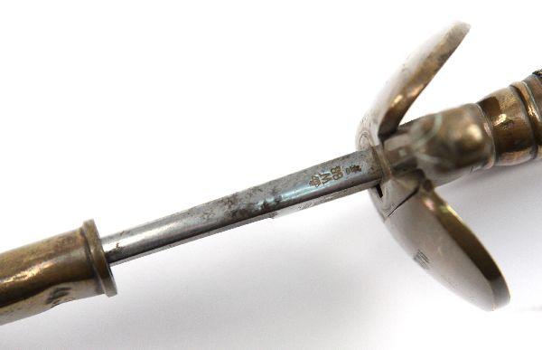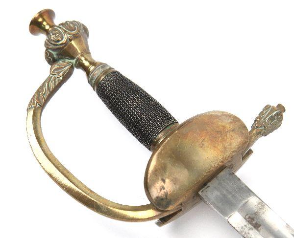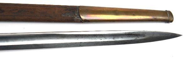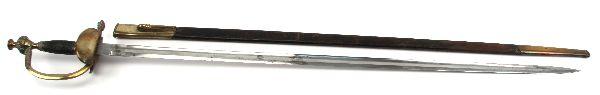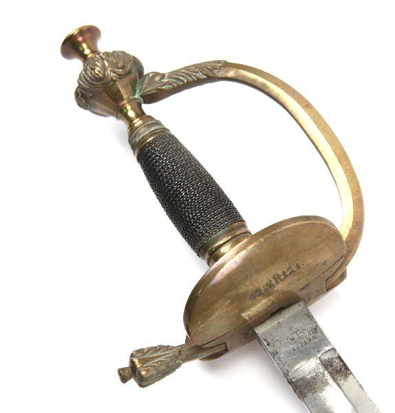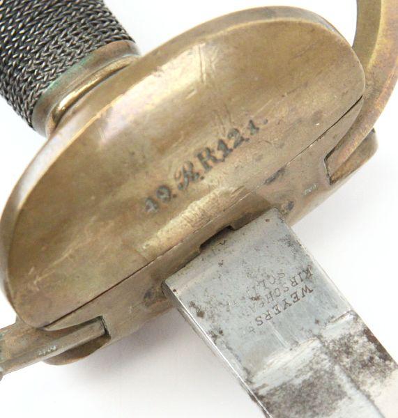 33 inch fullered blade marked "Weyersberg Kirschbaum & Co Solingen". Folding clamshell guard marked "49.R.R.12.1", brass wire wrapped grip with rounded pommel. Leather and brass scabbard marked "49.R.R.12.1". Overall very good condition with some losses to leather and dents to brass on scabbard and minor discoloration to blade.