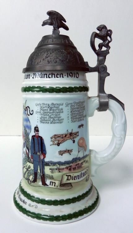 WWI IMPERIAL GERMAN REGIMENTAL COVERED STEIN-FOR A WWI BAVARIAN FLYER---<br><br><br>GREAT LOOKING STEIN-UNIT MARKED "1.BAYERISCHES LUFTSCHIFFER-BATAILLON MUNCHEN-1910--GREAT IMPERIAL BAVARIAN GRAPHICS IN FRONT WITH CROWN & REGIMENTAL