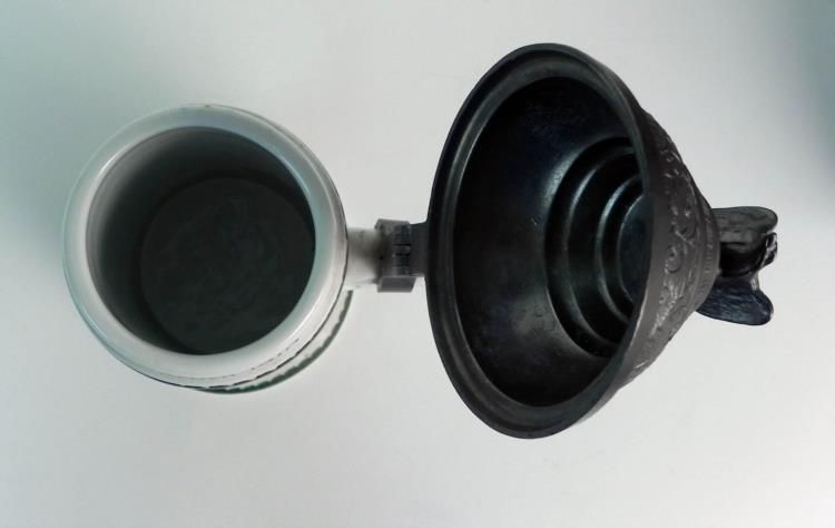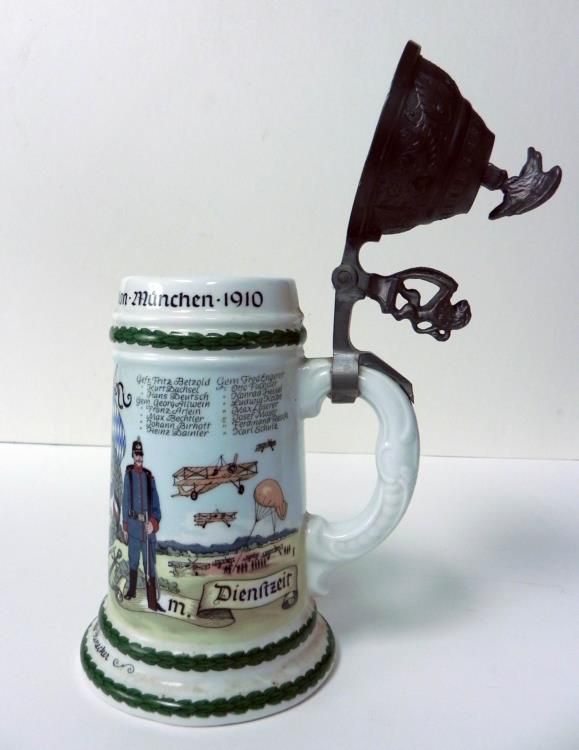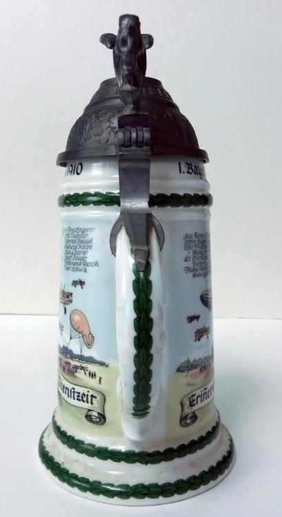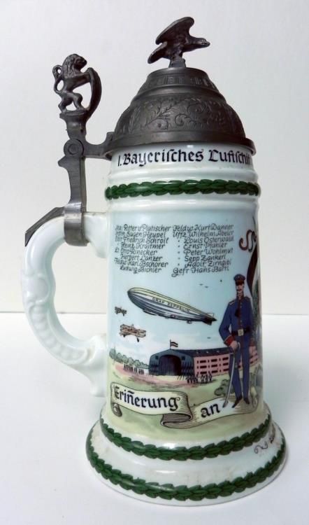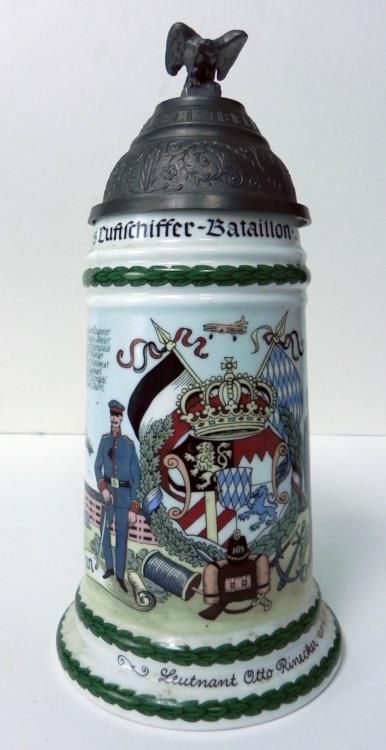 WWI IMPERIAL GERMAN REGIMENTAL COVERED STEIN-FOR A WWI BAVARIAN FLYER---<br><br><br>GREAT LOOKING STEIN-UNIT MARKED "1.BAYERISCHES LUFTSCHIFFER-BATAILLON MUNCHEN-1910--GREAT IMPERIAL BAVARIAN GRAPHICS IN FRONT WITH CROWN & REGIMENTAL SOLDIERS----BI-PLANE ON TOP--NAMES OF BATTALION ON SIDES--STEIN NAMED TO "LEUTNANT OTTO RINECKER" ON BASE--GRAF ZEPPLIN ON SIDE--PEWTER TOP & CONNECTION HAS BAVARIAN LION WITH SHIELD ON THUMB PORTION--EAGLE IN FLIGHT ON TOP--GERMAN MADE ON BASE-PROBABLY POST WAR--GREAT REGIMENTAL STEIN-9 1/2" TALL