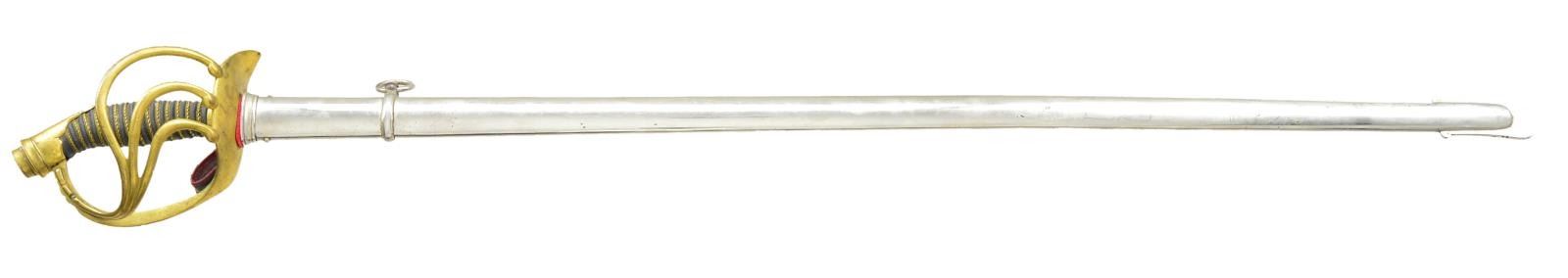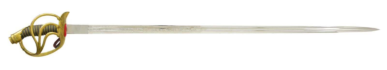 Overall length 43". Blade length 36 1/4". Double fullered blade with foliate & geometric etching over the first 15" of the blade. One side of the blade has a central 2 1/4" panel with a Prussian eagle. Gilded brass hilt has 3 branches that join the knuckle bow. Wire wrapped sharkskin grip. Plated scabbard. CONDITION: blade shows original factory polish. Hilt retains 85% of original gilded finish. Grip & wire are complete. Scabbard shows light wear. PROVENANCE: From the Lifelong Collection of Glen E. Mattox. (02-18714/BF). $400-600.