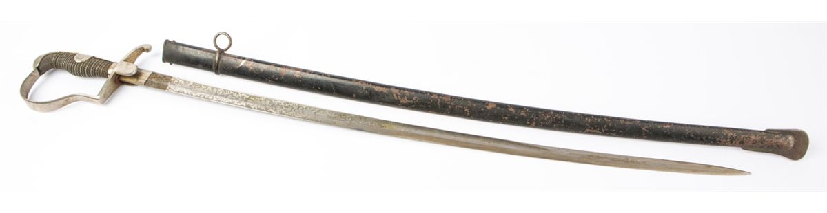 IMPERIAL GERMAN ETCHED OFFICERS SWORD EICKHORN Imperial German Army Officers sword, maker marked with Eickhorn double squirrel logo under langet. 31.5 inch blade, double etched to 14 inches with floral scroll and military motif. Wire wrapped shagreen grip, wit steel hilt and "P" knuckle bow. Steel scabbard with enamel finish. Type: sword Country: germany