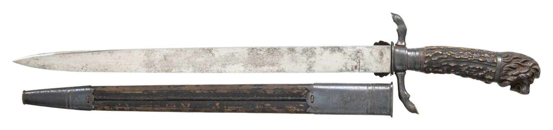 An exquisitely artistically produced Imperial German WWI era Hunting Association dagger or cutlass measuring 21 3/4" overall with a plain15 7/8" unmarked blade. Polished steel hilt with a down turned scallop shell guard and hooves at the quillons. Superb polished steel lion head pommel with a horn grip. Polished steel mounted leather scabbard with acorn frog stud. CONDITION: blade has some very minor discoloration. Hilt shows light wear and the steel has a wonderful dark patina. The scabbard mounts share the same patina and the leather body has 40% finish loss. (02-24916/BF). NON-GUN. $500-750.