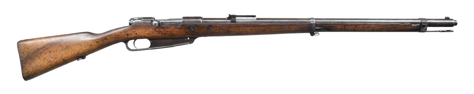 MILITARY RIFLE SUPPLIED TO TURKEY. Cal.8mm Mauser. S# 5505p. Bbl. 29 1/4" w/ ladder rear sight re graduated w/ Turkish numerals to 2,000 meters. Inverted V front sight. Receiver ring is marked on top w/ "LOEWE BERLIN 1891". Also marked w/ "S" indicating the throat of the chamber altered in 1905 for the S Type ammunition. Rifle has been given the Model 1905 conversion to use the standard Mauser stripper clips. The conversion includes addition of a spring loaded cartridge retainer in the left receiver rail & the addition of a thumb slot in the left rail obscuring a portion of the rifle markings. The mag. has an added dust cover at the bottom. Clip guides were riveted to the side of the receiver bridge. Straight handled bolt assembly w/ matching numbers & the Turkish crescent moon acceptance marks. Balance of rifle numbers are non matching throughout. Correct cleaning rod is present. Upper band has German unit markings. Walnut stock retains traces of original Imperial German acceptance marks. CONDITION: stock has arsenal rework type finish w/ extensive wear, dents, staining & scratches. Notable lg. missing chip from left side of forend & additional crack at the wood line. Right side of forend has chipping issues at wood line. Buttplate & trigger guard show loss of wood in inletted areas. Metal is well worn turning gray w/ oxidation and light pitting throughout. Bbl. jacket has notable dents on the left side near muzzle. Dust cover at bottom of magazine well dated 1914 has broken thumb tab. Good shiny bore w/ lightly worn lands. (01-23446/RW). ANTIQUE. $400-600.