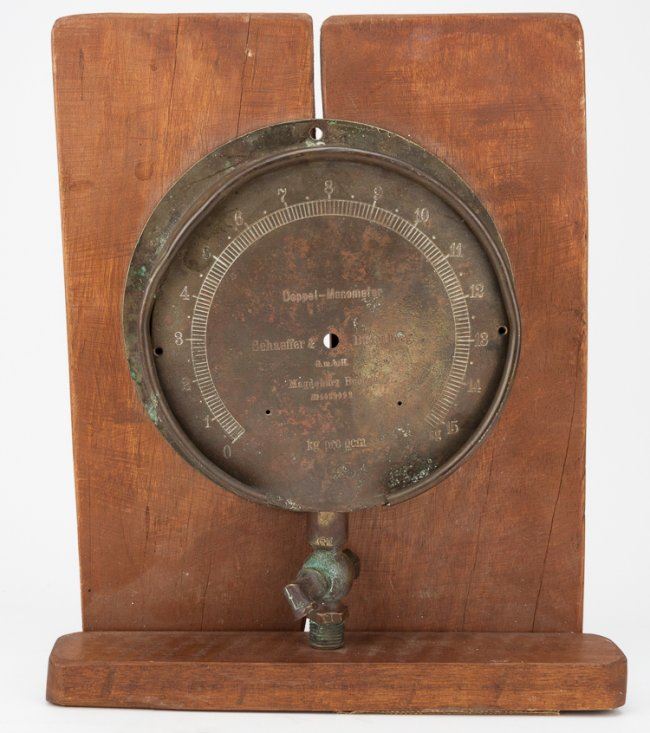 Antique brass case and fittings from a double manometer once fitted to an Imperial German naval vessel, or possibly a U-boat. The maker, Schaeffer & Budenberg, was located in Magdeburg. Simply mounted to a wood stand.