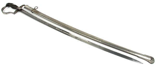 Late 19th Century Imperial German Officer's saber. 34.5 inch blade, with etched inscription "1st Electoral Hessian Field Artill. Rgt. No. 11", flanked by crossed cannons. Floral scroll etching on obverse. Hilt is plated, with wire wrapped leather grip. Rolled steel plated scabbard, with single hang ring. Some losses to plating on hilt. Blade very good. Two minor "door dents" to scabbard. Overall very good condition, With copy of COA.
