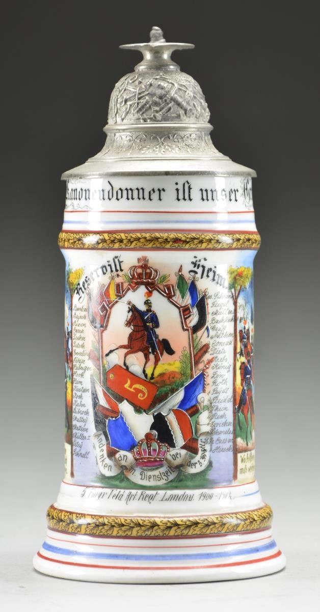BAYERN ARTILLERY REGIMENT. Stein measures 10" in height. The body of the stein reads "5. Bayr. Feld Art. Regt. Landau. 1900-1902" near the base. The top reads "Kanonendonner ist unser Gruk." The central portion includes vivid polychromatic scenes of an artillery unit moving cannons & engaged in battle. The base has a lithophane that shows a domestic scene. Elaborate pewter domed lid has had the finial removed. CONDITION: light wear overall. As stated, the finial is missing. PROVENANCE: From the Lifelong Collection of Glen E. Mattox. (02-18646/BF). $250-400.