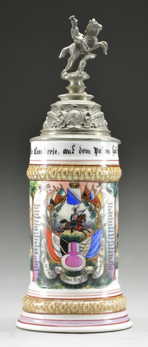 UHLAN REGIMENT. Stein measures 11 3/4" in height. The body of the stein reads "96 Bei Der 3. Gsld. II Bayn. Ulan Regt. Konig Ausbark 99" near the base. The top reads "Stok zu Ross die Cavallerie, auf dem Posten spat und fruh". The central portion includes vivid polychromatic scenes of Uhlan soldiers charging & visiting at a village. The base has a lithophane that shows a domestic scene. Elaborate pewter domed lid is topped with a charging Uhlan soldier on horseback. CONDITION: light wear overall. The finial is slightly bent. PROVENANCE: From the Lifelong Collection of Glen E. Mattox. (02-18641/BF). $350-550.