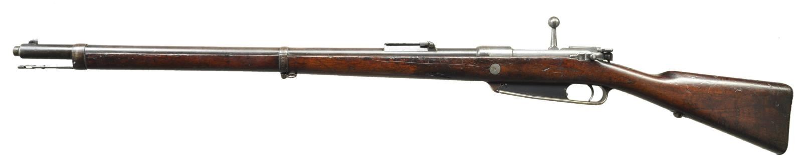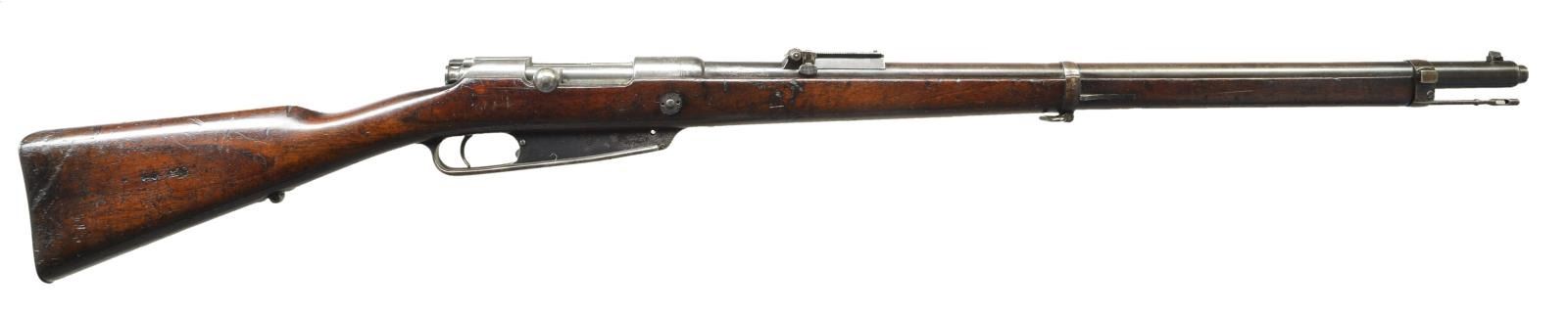 MODEL 88 COMMISSION RIFLE. Cal. 8mm Mauser. Ser. #3715T. Bbl. 29-1/4". All visible numbers match except bolt head. Receiver ring is marked on top w/ "Imperial crown" "SPANDAU" "1890" & "S". Right side of receiver ring has "Imperial proofs". Left receiver rail marked in Gothic "Gew 88". Ladder rear sight graduated to 2000 meters. Inverted V front sight. Correct dbl. loop cleaning rod. Markings on lower band "6.R.E.1.157." indicating service w/ the 6th Infantry Regiment. Walnut stock. Buttstock marked on right side w/ "Crown W" & additional "Crown" inspector's mark. Additional inspector's marks appear under grip & at belly of stock. Detachable butt swivel is not present. CONDITION: stock has moderate wear, scratches & handling marks. Approx. 1" crack behind receiver tang & notable gouge & scratch on left side of forend. Stock given additional finish sometime in the past. Bright receiver & bolt turning gray w/ scattered spots of fine oxidation. Bbl. shroud has turned overall gray & patina w/ scattered sm. dents & handling marks. Has notable area of shallow pitting between receiver & rear sight. Bore is shiny but w/ worn lands. (01-21520/RW) ANTIQUE. $400-600.