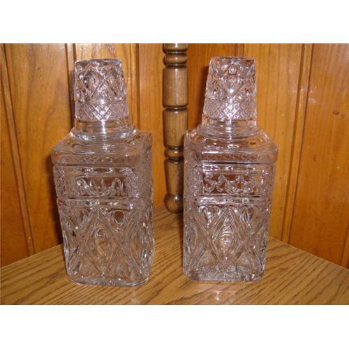 This beautiful Decanter set. Is the Cape Cod Clear pattern by Imperial Glass OHIO, It is the Whiskey and Bourbon with shot glass stoppers. They read Whiskey on 1 and Bourbon on the other. They are in excellent condition with no nick's, chip's or scratches on them. These are hard to find item's and will make a great addition to any collection large or small. C.1950