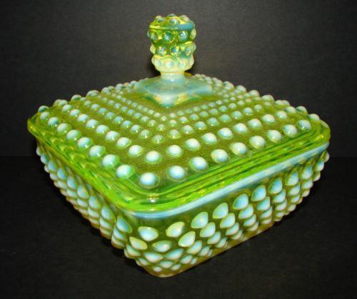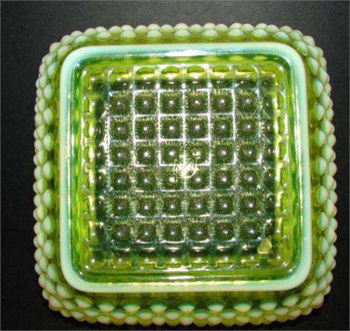 IMPERIAL GLASS CO. SQUARE FORM OPALESCENT VASELINE GLASS COVERED CANDY DISH. Hobnailed pattern. Marked on bottom with moulded mark. 5” H