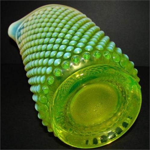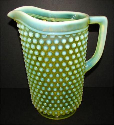 IMPERIAL GLASS CO. OPALESCENT VASELINE GLASS PITCHER. Hobnailed pattern. Marked on bottom with moulded mark. 9.25” H