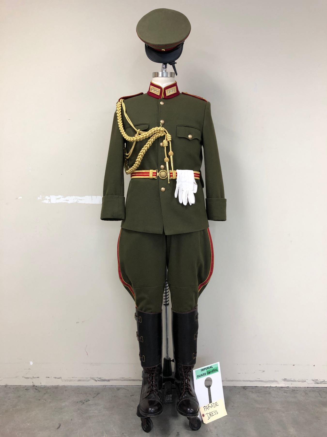 COMES WITH JACKET, PANTS, LEATHER BELT W/ BUCKLE & GUN HOLSTER, WHITE COLLAR, INSIGNIA COLLAR TABS, HAT, PARADE DRESS ACCESORIES (BELT, AIGUILLETTE, & WHITE GLOVES) & BOOTS