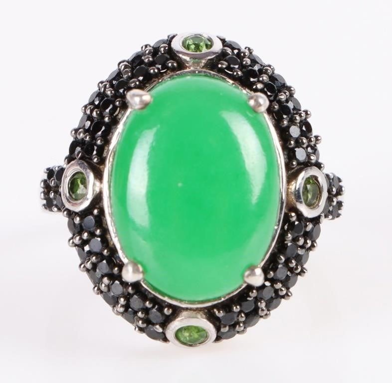 0.925 silver green jade peridot onyx ladies ring to include one 5.00ct cabochon green jade, four 0.05ct round cut peridot, and fifty-six 0.015ct round cut onyx.