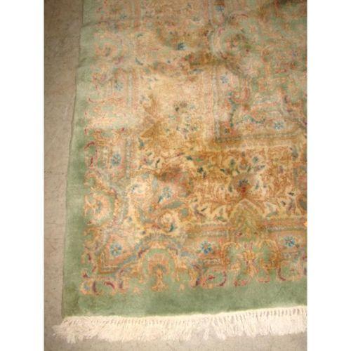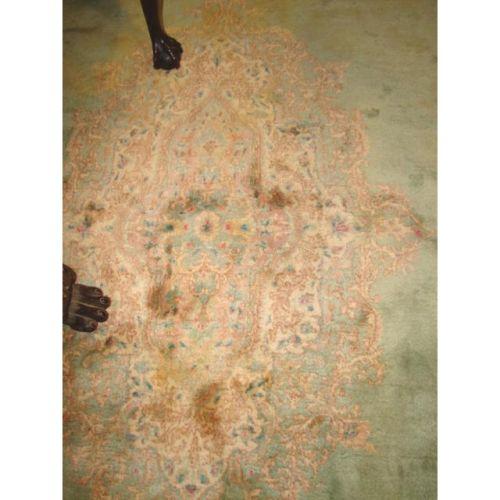 IMPERIAL KERMAN WOOL PERSIAN RUG. With center medallion and border. Decorated with lime green, tan, brown, & blue colors. 10’ x 14’