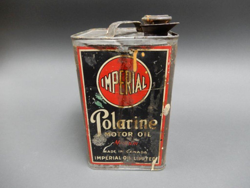 IMPERIAL RED BALL POLARINE IMP. GAL CAN EMBOSSED TOP & CAP- SOLDERED HANDLE & SPOUT- CORRECT CAPS- STAINING & DENTING LOCATION: LOWER LEFT