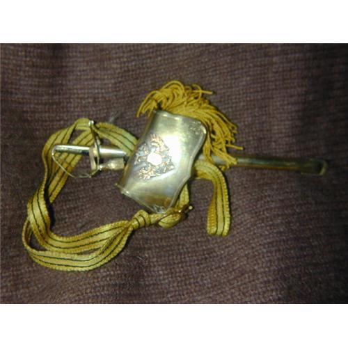 The ribbon that is similar to a sword knot is gold and black similar to the colours of the order of St George. It serves as a wrist band for the lady who carried it. There is no dance card in the holder.