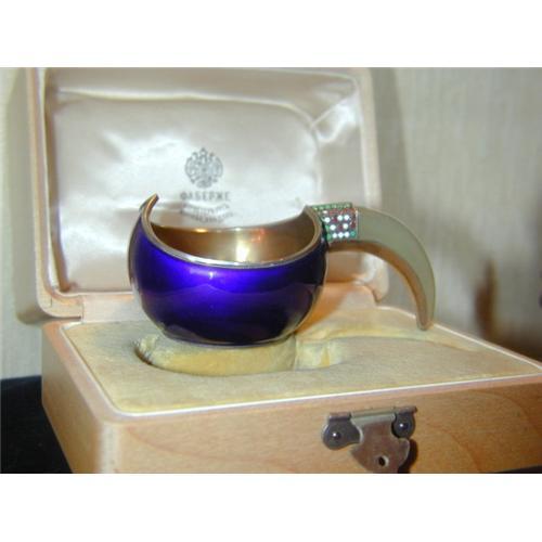 We are privileged to offer this gorgeous dark blue enameled miniature kovsch. It bears the mark of Faberge.