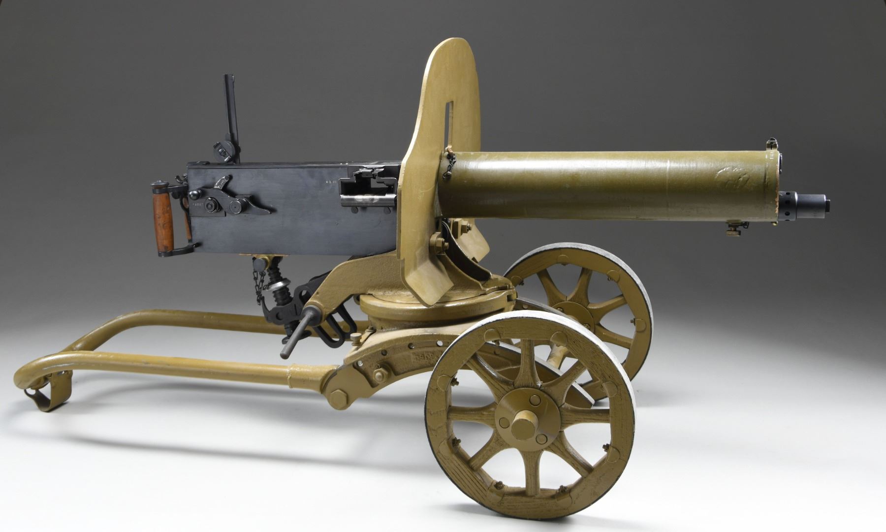 UTILIZING FINNISH PARTS ON GERMAN MG08 RECEIVER. Cal. 7.62x45R. S# 6172. Bbl. 30". A beautiful example of a WWI German Maxim Machine Gun assembled in the Russian Model 1910 configuration, as reworked by the Finnish. NFA Registry lists the manufacturer / importer as "Germany WWI Spandau 1917". Although the paperwork states 7.92 as the caliber it is presently chambered in 7.62x54R. The receiver & sideplates retain their German markings. The fusee cover is Russian, retaining some of the original nomenclature, highlighted in white for a sharp contrast and easier to read. The top cover & the majority of the remaining parts are Finnish, many bearing matching serial numbers. This example has a smooth water jacket, matching in finish to the armor plate & 1910 Sokolov wheeled mount. Exposed blade front sight coinciding w/ slot in armor plate to line up with the windage & elevation adjustable rear sight, marked from 100 meters to 2000 meters. Blued finish on receiver & all exposed metal parts rearward of the armor plate. Matching painted green finish on water jacket, armor plate & tripod. Hardwood spade grips w/ blued hardware. MAGS: 1 cloth belt w/ brass eyelets & tabs. CONDITION: Gun & mount are in beautiful condition. Blued components enjoy complete & consistent coverage. Many markings are filled w/ white for a sharp contrast both attractive & easy to read. Painted portions are matching in coverage & color. Hardwood grips have typical period correct impressions & blued surfaces match the remainder of components w/ complete coverage. Both the mount & firearm components that move, do so w/ ease & retain fluid movement. Bore is bright w/ strong rifling. Fire control mechanism appears to function correctly when cycled by hand. NATIONAL FIREARMS ACT MG REQUIRING BATF TRANSFER BEFORE TAKING POSSESSION. FULLY TRANSFERABLE. PROVENANCE: From the Lifelong Collection of Brian Linde. (03-1816/JZ). CURIO CLASS III. $8,000-12,000.