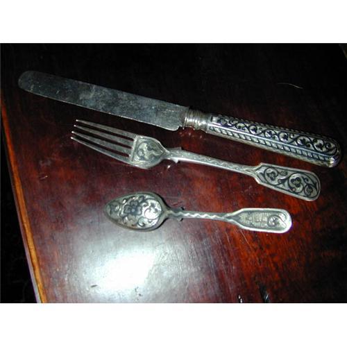 We are please to list an incredible Imperial Russian neillo dessert set made in Russia during the 1860s. Made of 84 zlotny silver. It is composed of 18 pieces: of 6 knives (8 inches long), 6 forks (6 inches long) and 6 neillo demitasse spoons (4.4 inches).